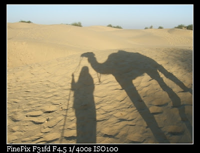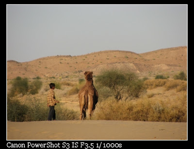 吉普車把我們在到不明的點,駝家把我們的座騎情人帶來了,穿了衣服的camel耶,真可愛,他的衣服其實就是我們晚上將要蓋的棉被拉,駝人有個年幼的小跟班,他說是因為學校放假來的,長的很可愛!!印度男孩大都長的很可愛,怎麼長大完全變調了 @@ 希望他長大是個帥哥, 還依舊靦腆 ^^